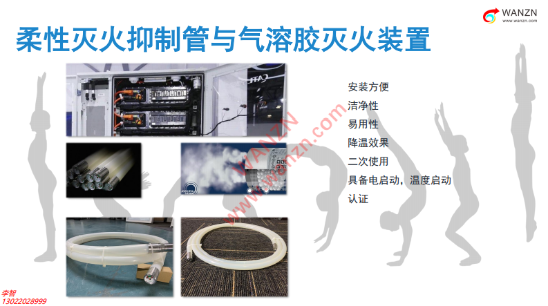 我們還有另外兩種,氣溶膠以及柔性滅火抑制管,這兩個為什么放在一塊兒?因為它比較簡單,都可以做預制,到了項目現(xiàn)場或者當?shù)夭恍枰?,可以自行變更,不用擔心設備還會出現(xiàn)什么問題。上面這個圖片大家可以看到,這也是我從公開的資料上截取的,是寧德的,這個方案也是我們在提供的。雖然它們都是潔凈氣體,一個是在釋放之后要立即進行殘留物處理,另外一個柔性抑制管是潔凈氣體,不存在殘留物的問題。也就是說,我們的儲能在偏遠地方的時候,一般無人值守,性抑制管如果產(chǎn)生一些誤噴或者誤啟動,可以很好的解決,目前很多客戶已經(jīng)將性抑制管銷到北美和其他地方去,這是非常好的產(chǎn)品。目前在柜臺里用到的幾個產(chǎn)品,都是用在使用,并且應用的非常廣泛。