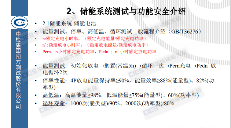 首先我們以36276為標(biāo)準(zhǔn)介紹儲(chǔ)能電池最常見的項(xiàng)目。36276里面有標(biāo)準(zhǔn)的術(shù)語(yǔ)定義,這跟我們平時(shí)叫倍率充放電電流規(guī)格有點(diǎn)不同,它會(huì)定義額定充放電小時(shí)率n/n,,就是說(shuō)這個(gè)n是要由企業(yè)自己提供的。如果n是大于1的話,這個(gè)電池就屬于能量型電池;如果n小于等于1,就是功率型電池,標(biāo)準(zhǔn)對(duì)功率型電池和能量型電池的測(cè)試要求是不一樣的。首先是能量測(cè)試,它有一個(gè)定義是n小時(shí)額定充電功率和n小時(shí)額定放電功率,如果之前做動(dòng)力或者消費(fèi)型電池的企業(yè)就很難理解有這種參數(shù),這種參數(shù)就是在進(jìn)行檢測(cè)認(rèn)證的時(shí)候,首先檢測(cè)機(jī)構(gòu)會(huì)讓你提供相關(guān)的資料。一般我們簡(jiǎn)單地說(shuō),如果n是1,那就是1倍率,相當(dāng)于你用最大的功率一小時(shí)內(nèi)可以充滿電池的能量。如果是功率型的話,一般是0.5,那就是0.5小時(shí)以最大功率充電,可以把這個(gè)電池單體或者電池包充滿。能量測(cè)試的測(cè)試過(guò)程就是簡(jiǎn)單地做充放電處置,然后常溫?cái)R置,再進(jìn)行循環(huán),再用額定充電功率充滿,再用額定放電功率放完,再循環(huán)兩次,再記錄它充放電過(guò)程中的檢測(cè)數(shù)據(jù)。倍率性能,因?yàn)?6276只是說(shuō)電力儲(chǔ)能用的電池標(biāo)準(zhǔn),沒有區(qū)分是哪一類電池,但如果很多是三元電池的話,倍率性能或者循環(huán)壽命是很難達(dá)到的。倍率性能,如果是4P放電能量要保持在90%,能量效率(充電和放電比值,放電/充進(jìn)去的能量和放出去的能量的比值),它有規(guī)定要求,如果是能量型的,能量效率不能低于88%,如果是功率型就不能低于82%。高低溫項(xiàng)目是針對(duì)電池在高低溫環(huán)境下存儲(chǔ),因?yàn)閮?chǔ)能電池相對(duì)工作環(huán)境沒有像動(dòng)力那么苛刻,它最低溫度在5度存儲(chǔ),最高溫度在45度存儲(chǔ),不像有一些消費(fèi)電池是負(fù)10度、負(fù)15度,它工作環(huán)境相對(duì)比較穩(wěn)定。然后是典型的性能項(xiàng)目,就是循環(huán)壽命,如果是針對(duì)單體,單體如果是能量型的要進(jìn)行一千次以上的循環(huán)實(shí)驗(yàn),如果是功率型要進(jìn)行兩千次。能量型一千次循環(huán)壽命之后,能量保持率不能低于90%,功率型不能低于80%。但是這個(gè)標(biāo)準(zhǔn)也有對(duì)模塊循環(huán)壽命測(cè)試,模塊壽命就沒有說(shuō)要1000次、2000次的yaoq,模塊循環(huán)壽命檢測(cè)標(biāo)準(zhǔn)只要進(jìn)行500次和1000次。所以這個(gè)循環(huán)壽命能達(dá)到2000的,如果用三元電池的話,基本上目前很難達(dá)到。但如果磷酸鐵鋰的話,有些八九千次循環(huán)后能保證80%的,應(yīng)該很多企業(yè)也能做到。