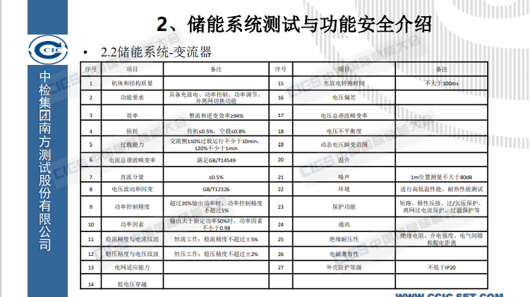 這是變流器的一些檢測(cè)項(xiàng)目。因?yàn)槟壳皝?lái)講這些標(biāo)準(zhǔn)涵蓋內(nèi)容都很齊全,總共27個(gè)項(xiàng)目,涵蓋功能、安全、性能、環(huán)境,基本都有,我就不具體再介紹。但是這里面比較重要的項(xiàng)目是一些過(guò)載能力和效率、功能要求,功能要求也是變流器的一個(gè)基本要求,控制充放電、控制能量效率、功率調(diào)節(jié)、并離網(wǎng)的功率切換,還有一些環(huán)境溫升要求,我就不再詳細(xì)介紹。