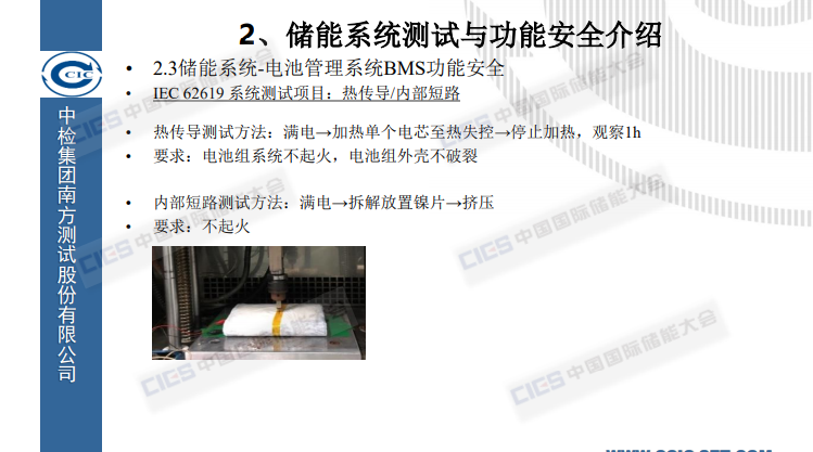 2.安全項(xiàng)目。因?yàn)檎麄€(gè)儲(chǔ)能工作環(huán)境比較穩(wěn)定,它沒有振動(dòng)沖擊的項(xiàng)目,包括沒有一些運(yùn)輸測(cè)試項(xiàng)目。它也是分電芯、模組和電池簇三部分,電芯的主要項(xiàng)目是絕熱溫升,溫升速率也是很緩慢,0.5℃/min。如果其他類別的電池,可能至少是5℃/min的溫升速率做循環(huán)。過(guò)充、過(guò)放、短路、擠壓(13KN,區(qū)別于動(dòng)力電池最低200KN),包括電芯、模組的擠壓都是用13KN。如果是動(dòng)力電池的模組,就是根據(jù)串聯(lián)的級(jí)數(shù),擠壓力值要乘以串聯(lián)級(jí)數(shù)。包括模組,模組和電池簇里面有一些電安全項(xiàng)目,就是絕緣、耐壓和鹽霧、高溫高濕、熱失控,熱失控與電芯熱失控測(cè)試方法類似。因?yàn)榭紤]到模組里面的評(píng)判要求。簡(jiǎn)單地說(shuō),擠壓、熱失控、過(guò)充、過(guò)放,基本的測(cè)試方法與其他類別的電池是一樣的,只是它的具體測(cè)試參數(shù)不同。