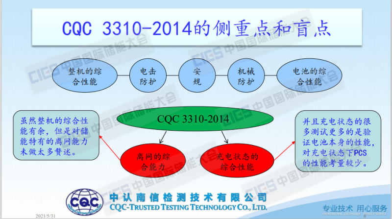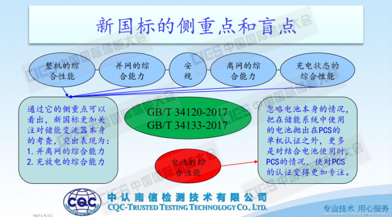 新國標(biāo)的側(cè)重點(diǎn)和盲點(diǎn)。34120相當(dāng)于是一個(gè)要求,34133是一個(gè)執(zhí)行的方法,內(nèi)容上更加側(cè)重于整機(jī)的性能,包括并網(wǎng)綜合能力、安規(guī)、離網(wǎng)能力以及充放電的綜合性能。其實(shí)可以看出來兩個(gè)不同標(biāo)準(zhǔn)對比一下的話,它的側(cè)重點(diǎn)就能夠突出地表現(xiàn)出來,就是更加注重并離網(wǎng)的綜合能力和充放電的綜合能力。但是我們的34120包括34133這兩個(gè)標(biāo)準(zhǔn)對于電池的綜合性能其實(shí)沒有更多的贅述,并沒有做更多的要求,因?yàn)槟悻F(xiàn)在電池其實(shí)有單獨(dú)的電池標(biāo)準(zhǔn)去對電池做要求,所以它在34120、34133里面沒有過多說這方面的東西