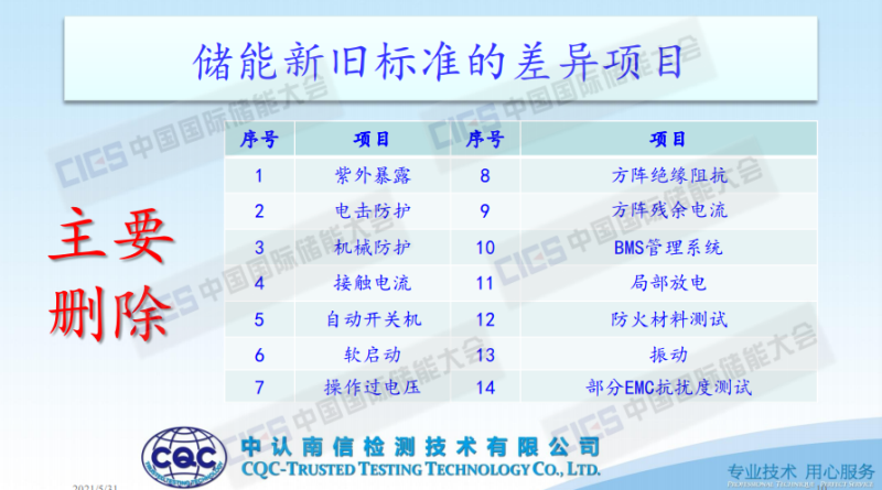 主要內(nèi)容有五個(gè):一、儲能測試標(biāo)準(zhǔn)的選擇。因?yàn)橹坝锌蛻糇稍兾覀儍δ軜?biāo)準(zhǔn)到底有什么區(qū)別,我們的產(chǎn)品做檢測認(rèn)證該怎么選標(biāo)準(zhǔn);二、新舊標(biāo)準(zhǔn)的側(cè)重點(diǎn)和盲點(diǎn)。不同的標(biāo)準(zhǔn)會有不同的側(cè)重點(diǎn),以及在標(biāo)準(zhǔn)的選擇上會有一些盲點(diǎn),包括它的一些不確定的東西;三、新舊標(biāo)準(zhǔn)的差異項(xiàng)目對比;四、新舊標(biāo)準(zhǔn)測試項(xiàng)目分類;五、新舊標(biāo)準(zhǔn)測試項(xiàng)目內(nèi)容的重點(diǎn)差異。最終講的是現(xiàn)行主流標(biāo)準(zhǔn)的重點(diǎn)差異。