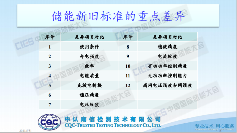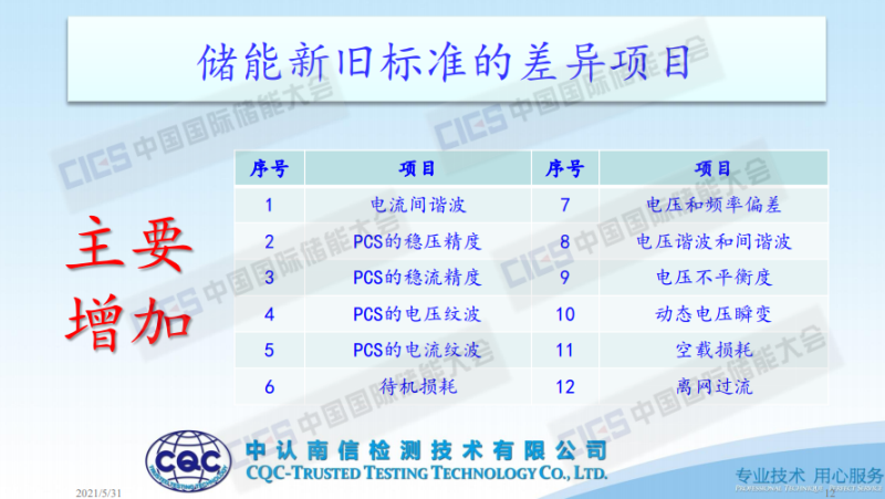 在34120、34133里面主要增加的是并離網(wǎng)的綜合能力、充放電的綜合能力、PCS單機(jī)的更有針對性的認(rèn)證,(圖示)這是我們主要增加的測試項(xiàng),之前也提到過,就是電流間諧波、PCS的穩(wěn)壓精度、穩(wěn)流精度、電壓紋波、電流紋波、待損耗等等。