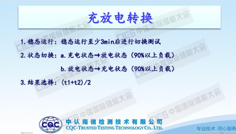 這就是充放電轉(zhuǎn)換,充放電轉(zhuǎn)換的穩(wěn)態(tài)運(yùn)行是要求儲能PCS變流器穩(wěn)態(tài)運(yùn)行3分鐘以后再進(jìn)行切換測試,測試主要分成兩個(gè)狀態(tài)切換:1.從充電到放電,2.從放電到充電,我們最終所采用的數(shù)據(jù)處理結(jié)果是按照兩個(gè)充放電的轉(zhuǎn)換時(shí)間t1+t2取一個(gè)均值,來作為充放電轉(zhuǎn)換時(shí)間的結(jié)果。這是兩個(gè),一個(gè)是充電到放電,一個(gè)是放電到充電,這是實(shí)測值。