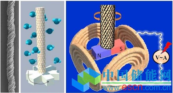 圖示:螺旋石墨烯纖維在濕度改變下帶動(dòng)磁鐵旋轉(zhuǎn)產(chǎn)生電能