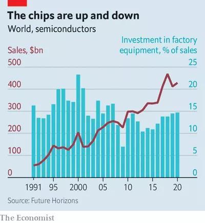 芯片行業(yè)咨詢公司Future Horizons的負(fù)責(zé)人馬爾科姆·佩恩(Malcolm Penn)說:“最重要的(要認(rèn)識到的)一點是,短缺是這個行業(yè)的一個自然現(xiàn)象?!彼f,芯片制造是經(jīng)濟(jì)學(xué)家所說的“豬肉周期”經(jīng)濟(jì)的一個很好的例子,以20世紀(jì)20年代美國豬肉市場首次分析的供應(yīng)不足和供應(yīng)過剩之間的規(guī)律性波動命名。與生豬一樣,芯片的供應(yīng)不能對需求的變化迅速做出反應(yīng)。佩恩表示,甚至在疫情大流行之前,芯片產(chǎn)能就很緊張。芯片制造商在工廠設(shè)備方面的投資多年來一直低于長期平均水平(見圖表)。