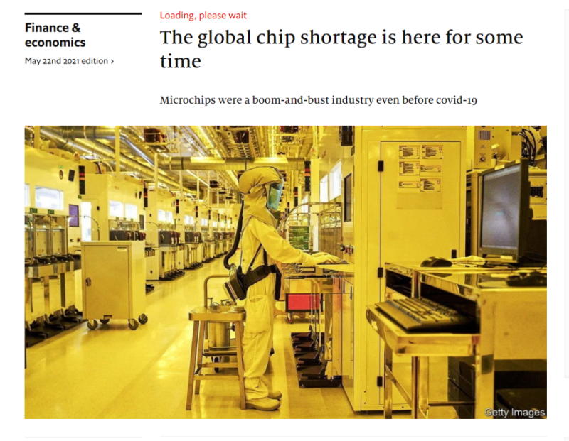 《經(jīng)濟(jì)學(xué)人》雜志發(fā)表文章,題目是:The global chip shortage is here for some time(全球芯片短缺將會持續(xù)一段時間)。
