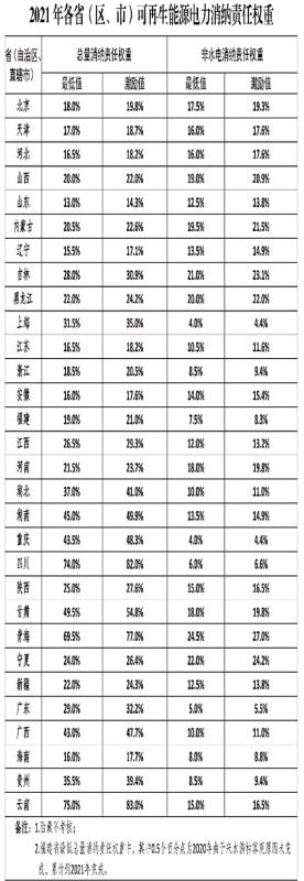 根據(jù)《通知》,從2021年起,每年初滾動(dòng)發(fā)布各省權(quán)重,同時(shí)印發(fā)當(dāng)年和次年消納責(zé)任權(quán)重,當(dāng)年權(quán)重為約束性指標(biāo),各省按此進(jìn)行考核評(píng)估,次年權(quán)重為預(yù)期性指標(biāo),各省按此開展項(xiàng)目儲(chǔ)備。
