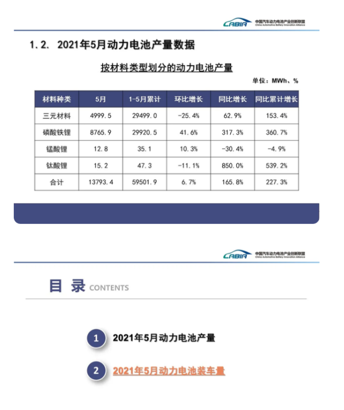 產(chǎn)量方面,2021年5月,我國(guó)動(dòng)力電池產(chǎn)量共計(jì)13.8GWh,同比增長(zhǎng)165.8%,環(huán)比增長(zhǎng)6.7%。其中三元電池產(chǎn)量5.0GWh,占總產(chǎn)量36.2%,同比增長(zhǎng)62.9%,環(huán)比下降25.4%;磷酸鐵鋰電池產(chǎn)量8.8GWh,占總產(chǎn)量63.6%,同比增長(zhǎng)317.3%,環(huán)比增長(zhǎng)41.6%。1-5月,我國(guó)動(dòng)力電池產(chǎn)量累計(jì)59.5GWh,同比累計(jì)增長(zhǎng)227.3%。其中三元電池產(chǎn)量累計(jì)29.5GWh,占總產(chǎn)量49.6%,同比累計(jì)增長(zhǎng)153.4%;磷酸鐵鋰電池產(chǎn)量累計(jì)29.9GWh,占總產(chǎn)量50.3%,同比累計(jì)增長(zhǎng)360.7%。