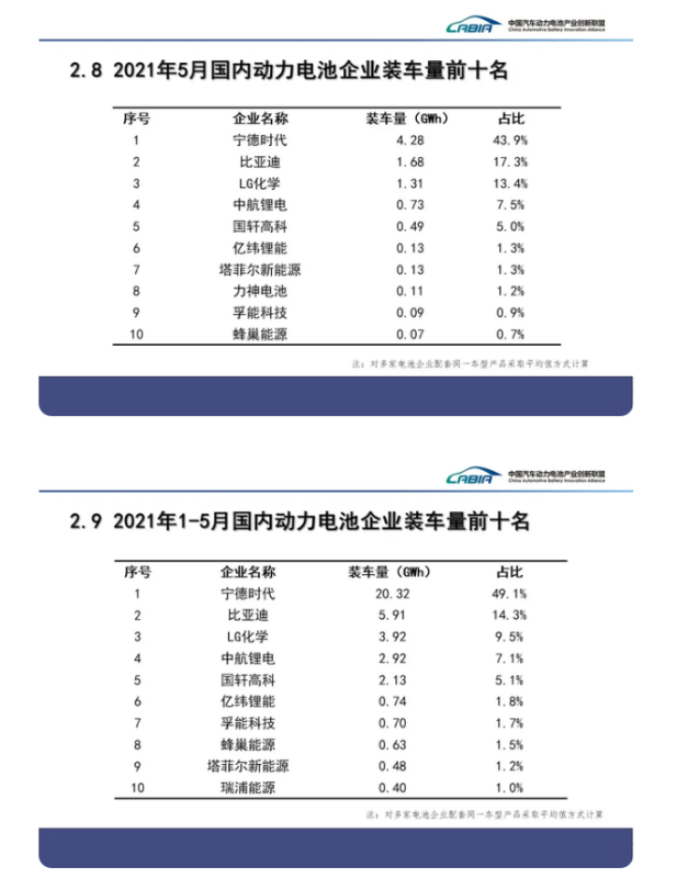 企業(yè)集中度方面,2021年5月,我國(guó)新能源汽車市場(chǎng)共計(jì)41家動(dòng)力電池企業(yè)實(shí)現(xiàn)裝車配套,較去年同期增加1家。排名前3家、前5家、前10家動(dòng)力電池企業(yè)動(dòng)力電池裝車量分別為7.3GWh、8.5GWh和9.0GWh,占總裝車量比分別為74.5%、87.1%和92.5%。前5月,我國(guó)新能源汽車市場(chǎng)共計(jì)51家動(dòng)力電池企業(yè)實(shí)現(xiàn)裝車配套,較去年同期減少3家,排名前3家、前5家、前10家動(dòng)力電池企業(yè)動(dòng)力電池裝車量分別為30.1GWh、35.2GWh和38.2GWh,占總裝車量比分別為72.8%、85.0%和92.2%。