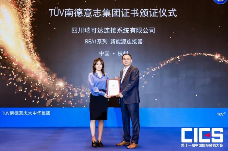 四川瑞可達(dá)連接系統(tǒng)有限公司(以下簡(jiǎn)稱“瑞可達(dá)”)項(xiàng)目經(jīng)理左鳳瓊女士出席了頒證儀式。該證書的獲得標(biāo)志著瑞可達(dá)該儲(chǔ)能系統(tǒng)專用連接器產(chǎn)品的安全性、可靠性符合歐洲市場(chǎng)的安規(guī)要求,為其扎根儲(chǔ)能領(lǐng)域,順利進(jìn)入國(guó)際市場(chǎng)增添競(jìng)爭(zhēng)力;同時(shí)也彰顯了TüV南德在新能源儲(chǔ)能系統(tǒng)國(guó)際標(biāo)準(zhǔn)規(guī)范編制中的權(quán)威性及影響力。