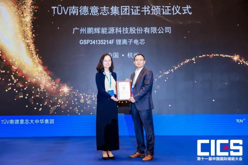 鵬輝能源旗下型號(hào)為GSP34135214F鋰離子電芯產(chǎn)品獲TüV南德安全認(rèn)證證書