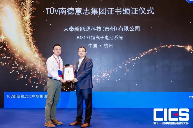 大秦新能源科技(泰州)有限公司(以下簡(jiǎn)稱“大秦新能源”)國(guó)內(nèi)銷售總監(jiān)許國(guó)民先生出席了頒證儀式。此證書的獲得標(biāo)志著大秦新能源B48100電池系統(tǒng)產(chǎn)品在電化學(xué)安全、功能安全、電氣安全、電磁兼容等方面均符合了國(guó)際儲(chǔ)能電池系統(tǒng)標(biāo)準(zhǔn)要求。此次項(xiàng)目合作將為雙方在儲(chǔ)能電池方面的合作奠定堅(jiān)實(shí)的基礎(chǔ),雙方將更深入合作打造質(zhì)量技術(shù)核心價(jià)值。