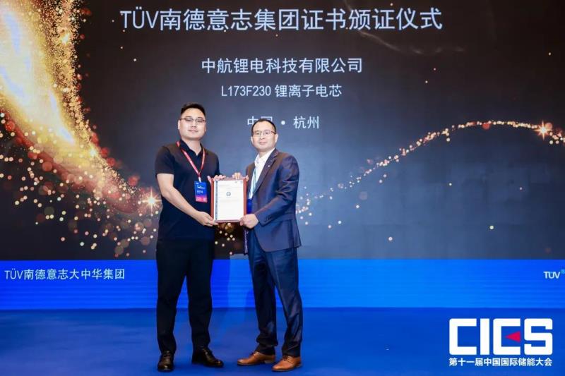 TüV南德大中華區(qū)智慧能源部副總裁許海亮先生(右)向中航鋰電儲(chǔ)能銷售總監(jiān)張帆先生(左)頒發(fā)TüV 南德產(chǎn)品認(rèn)證證書