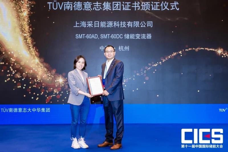 TüV南德大中華區(qū)智慧能源部副總裁許海亮先生(右)向采日市場(chǎng)總監(jiān)黃士芳女士(左)頒發(fā)意大利CEI 0-21并網(wǎng)證書