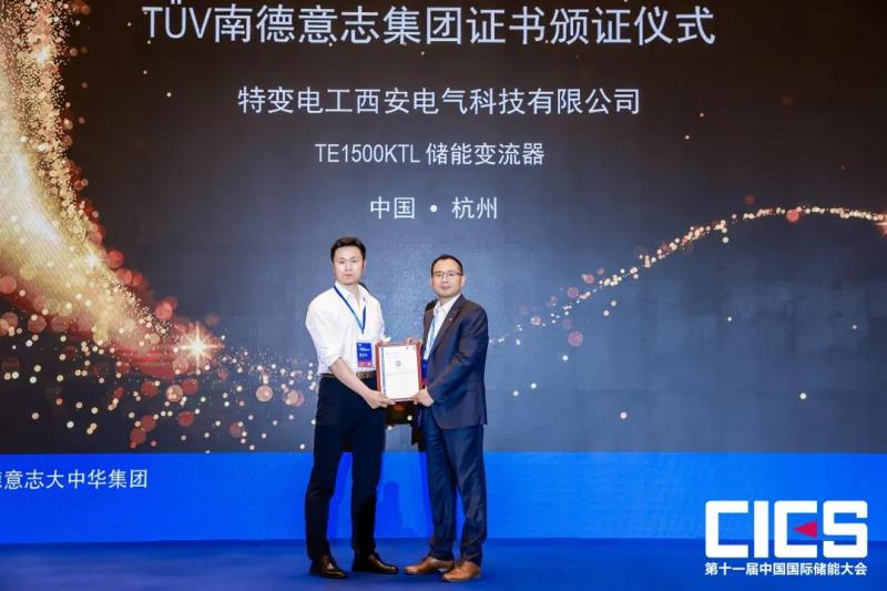 TüV南德大中華區(qū)智慧能源部副總裁許海亮先生(右)向特變電工西科儲(chǔ)能部長(zhǎng)趙亮亮先生(左)頒發(fā)TüV 南德產(chǎn)品認(rèn)證證書