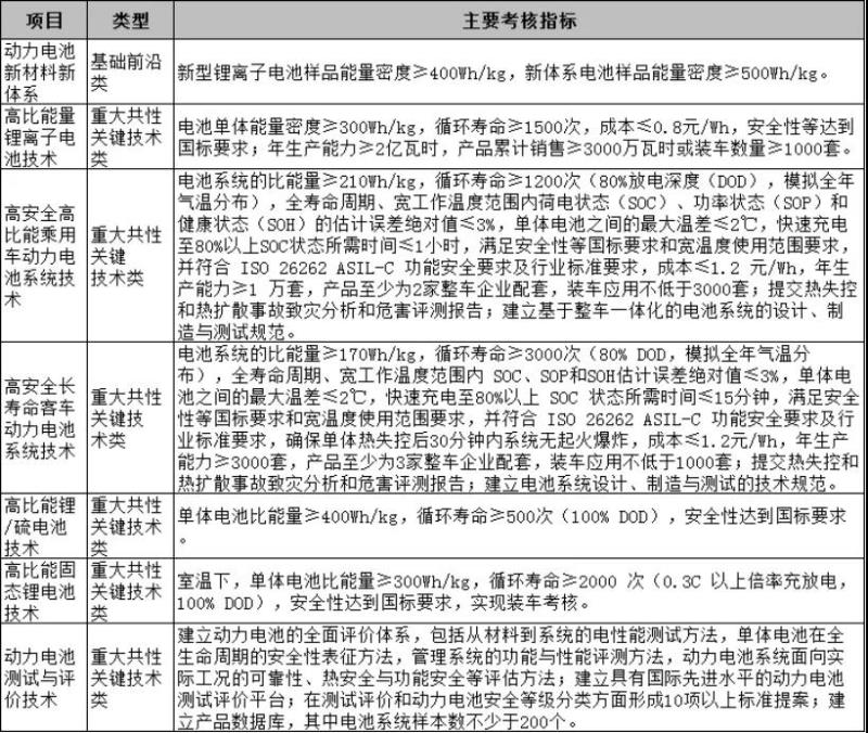 其中,在能源動力方面,將重點(diǎn)圍繞全固態(tài)金屬鋰電池技術(shù)、車用固體氧化物燃料電池關(guān)鍵技術(shù)、高密度大容量氣氫車載儲供系統(tǒng)設(shè)計及關(guān)鍵部件研制作出支持。主要考核指標(biāo)如下: