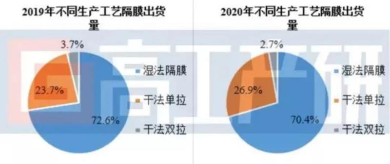 從隔膜產品結構來看,2020年濕法隔膜出貨量26億平米,同比增長30%,占總出貨量的70%。干法隔膜出貨量11億平米,同比增長超過40%,占總出貨量的30%。