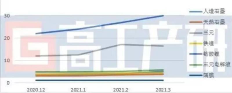 進入2021年第一季度,受下游市場需求拉動,四大主材價格均呈現(xiàn)不同程度上漲,但隔膜價格相較正極、負極、電解液等漲幅空間較小。