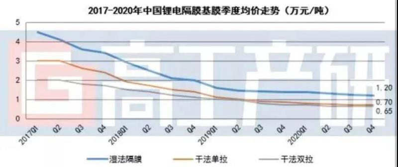 其中,2020年國內隔膜價格繼續(xù)下行,但降幅收窄,價格走勢全年呈現(xiàn)上半年顯著下降,下半年基本穩(wěn)定態(tài)勢。主要原因有: