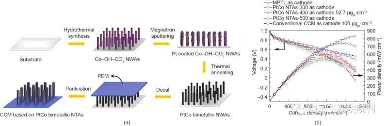 圖15(a)基于鉑鈷納米管陣列制造膜電極的示意圖。(b)基于鉑鈷納米管陰極的膜電極的性能比較,鉑鈷納米管在300 ℃、400 ℃和500 ℃進(jìn)行退火處理。測(cè)試條件:Nafion 212膜;膜電極有效面積為2.56 cm2 ;電池溫度為80 ℃;H2/O2,相對(duì)濕度為80%,背壓為0.2 MPa。轉(zhuǎn)載自參考文獻(xiàn),經(jīng)Elsevier Ltd.許可,©2017