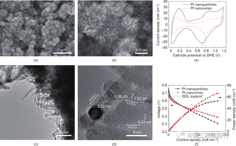 圖13 原位生長(zhǎng)在活性屏等離子氮化處理的GDL表面上的鉑納米線。(a、b)GDL表面的鉑納米線陣列的SEM圖像。(c)從鉑納米線陣列氣體擴(kuò)散電極上刮取的鉑納米線的TEM圖像。(d)為(c)中白方塊所示區(qū)域的HR-TEM圖像,顯示了沿<111>晶體方向生長(zhǎng)的單晶鉑納米線。(e)陰極循環(huán)伏安曲線。(f)膜電極在直接甲醇燃料電池中的極化曲線:膜電極的陰極分別為鉑納米線陣列電極(2 mg?cm–2)、Pt/C納米顆粒電極(JM的直接甲醇燃料電池陰極,4 mg?cm–2)和等離子處理的GDL。測(cè)試條件:膜電極面積為5 cm2 ;Nafion 117膜;電池溫度為75 ℃;JM陽(yáng)極(4 mg?cm–2)。CV測(cè)試時(shí)陰極為1 mL?min–1的超純水,陽(yáng)極為未加濕的氫[流速為每分鐘100標(biāo)準(zhǔn)立方厘米(sccm)]。極化曲線測(cè)試時(shí)陽(yáng)極為 1 mol?L–1甲醇(流速為1 mL?min–1),陰極為無(wú)加濕空氣(流速為100 sccm)。DHE:動(dòng)態(tài)氫電極。經(jīng)Springer Nature Limited許可,轉(zhuǎn)載自參考文獻(xiàn),©2014