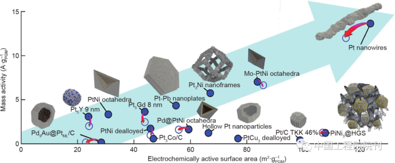 圖8 各種報(bào)道的燃料電池催化劑的ORR質(zhì)量活性比較(基于液體電解質(zhì)中半電池電化學(xué)測(cè)試的報(bào)道值)。填充的和空心的藍(lán)色圓圈顯示了加速老化試驗(yàn)前后的質(zhì)量活性和ECSA。HGS:空心石墨球。經(jīng)Elsevier B.V.許可,轉(zhuǎn)載自參考文獻(xiàn),©2018