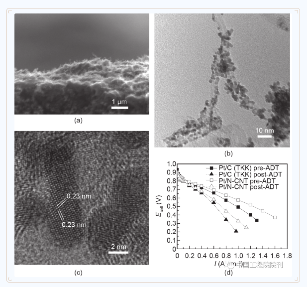 圖7(a)沉積了N-CNT陣列的GDL的橫截面的SEM圖像;(b)用鉑納米棒修飾的N-CNT的TEM圖像;(c)顯示沿<111>晶體方向生長(zhǎng)的單晶鉑納米棒晶格間距的HRTEM圖像;(d)加速老化試驗(yàn)(ADT)前后Pt/C納米顆粒和Pt/N-CNT陣列電極的極化曲線。測(cè)試條件:Nafion 212膜;MEA活性面積為16 cm2 ;陽(yáng)極為JM公司的Pt/C氣體擴(kuò)散電極(GDE);電池溫度為80 ℃,100%相對(duì)濕度的H2/空氣,化學(xué)計(jì)量比為1.3∶1.5,背壓為0.05 MPa;ADT:在0.6 V和1.2 V之間進(jìn)行3000次電位掃描循環(huán),掃描速率為100 mV?s–1,陰極為N2。經(jīng)Elsevier B.V.許可,轉(zhuǎn)載自參考文獻(xiàn),©2020