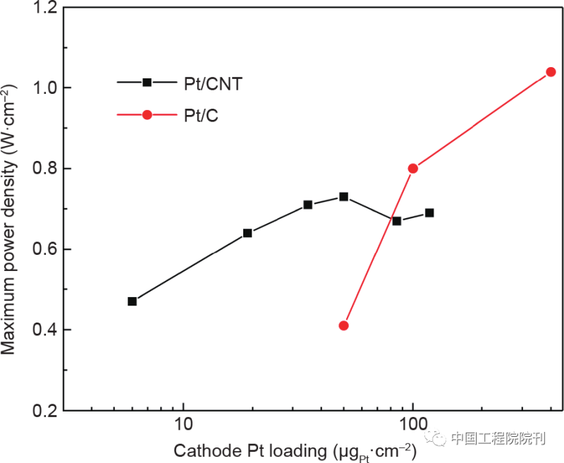 圖6 單電池測(cè)試中采用Pt/CNT和Pt/C陰極的膜電極的功率密度隨催化劑負(fù)載量變化的比較。MEA測(cè)試條件:Nafion 212膜;MEA活性面積為2 cm × 2 cm;陽(yáng)極:0.4 mg?cm–2 [JM Pt/C, 40%(質(zhì)量分?jǐn)?shù))Pt];測(cè)試溫度為80 ℃;H2/O2,背壓為0.2 MPa。數(shù)據(jù)來(lái)自參考文獻(xiàn)