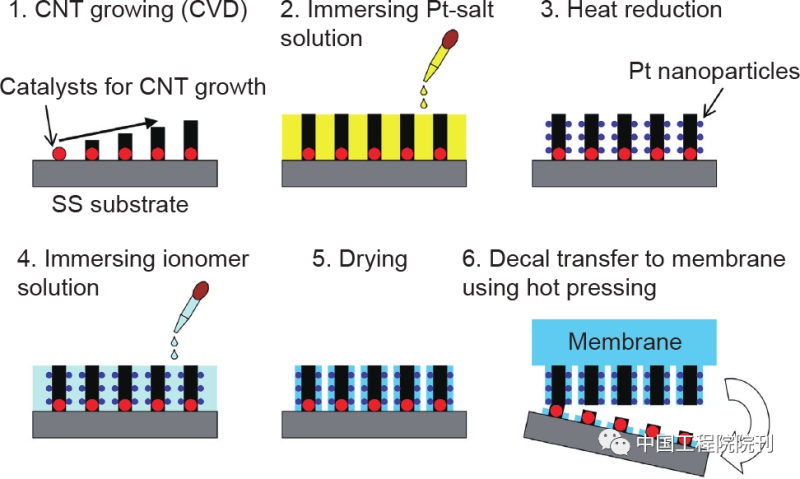 Pt納米顆粒修飾的CNT陣列電極的典型制備流程如圖5所示。一般來(lái)先是利用催化劑(如Fe或 FeCo)在襯底表面(如不銹鋼、SiO2、石英、鋁箔等)生長(zhǎng)CNT陣列,然后通過(guò)化學(xué)或物理方法在整個(gè) CNT或頂部沉積鉑納米顆粒,并在表面涂覆離子聚合物,最后利用熱壓的方法將帶有Pt納米顆粒的CNT陣列轉(zhuǎn)移到PEM上。