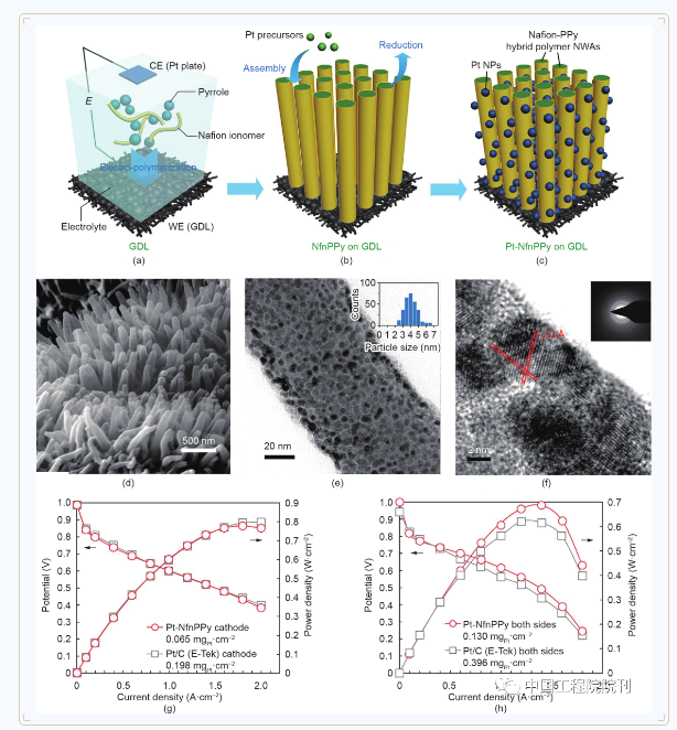 圖4(a~c)PPy NWA電極的制備流程圖:(a)電化學(xué)聚合法生長(zhǎng)PPy納米線;(b)負(fù)載Pt催化劑;(c)制備MEA。Pt-NfnPPy納米線的掃描電子顯微鏡(SEM)圖像(d)和透射電子顯微鏡(TEM)圖像(e),(e)中的插圖顯示了鉑納米顆粒的尺寸分布;(f)為Pt-NfnPPy的高分辨率透射電子顯微鏡(HRTEM)圖像,插圖為選區(qū)電子衍射(SAED)圖案;(g、h)在70 ℃和100%相對(duì)濕度下在H2/O2(g)和H2/空氣(h)中測(cè)得的以Pt-NfnPPy和常規(guī)Pt/C為電極材料的膜電極的極化曲線(Nafion 212膜,MEA活性面積為2 cm × 2 cm,化學(xué)計(jì)量比:H2 2,O2/空氣分別為9.5/2,壓力:0.15 MPaabs)。CE:輔助電極;WE:工作電極;NWA:納米晶須陣列。經(jīng)Springer Nature Limited許可,轉(zhuǎn)載自參考文獻(xiàn),©2015