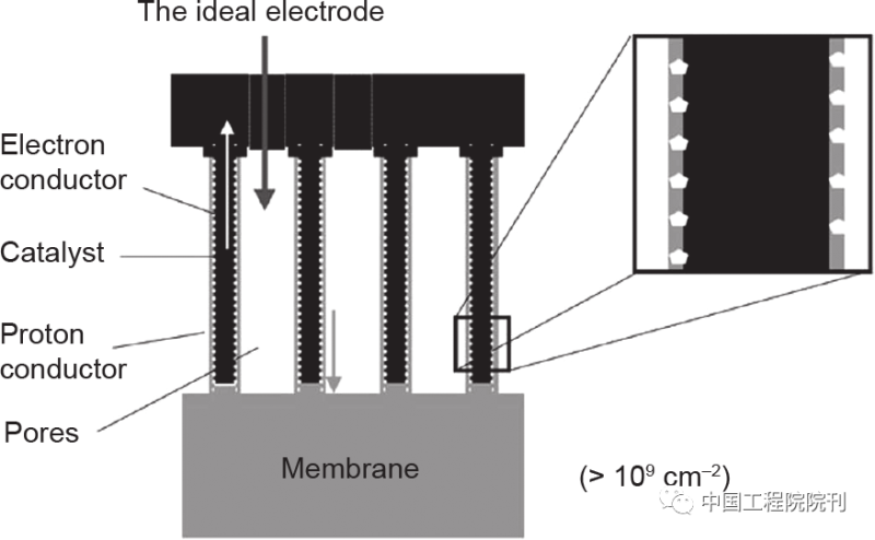 針對(duì)Pt/C納米顆粒電極存在的問(wèn)題,提出了基于一維催化劑納米結(jié)構(gòu)陣列的三維有序電極的概念,其目的是在超薄催化劑層內(nèi)大幅度改善有效的傳質(zhì)路徑以提高活性位點(diǎn)的利用率。Middelman提出了基于附載有催化劑的垂直定向的電子導(dǎo)體和質(zhì)子導(dǎo)體,并具有通孔結(jié)構(gòu)的三維有序電極結(jié)構(gòu)的理想模型,如圖3所示。這種獨(dú)特的電極結(jié)構(gòu)被認(rèn)為是能夠顯著提高催化劑利用率和功率特性的最有利途徑。近幾十年來(lái),陸續(xù)出現(xiàn)了基于一維納米結(jié)構(gòu)陣列的各種電極類(lèi)型,比如Pt催化劑修飾的垂直排列的納米線或納米管,以及獨(dú)立一維鉑基納米結(jié)構(gòu)催化劑陣列。其中的一些發(fā)現(xiàn),包括我們對(duì)鉑納米線陣列電極的研究,在最近一些催化劑材料開(kāi)發(fā)的綜述中也都有提及。與這些綜述文章不同的是,本文提供了一個(gè)基于三維電極結(jié)構(gòu)設(shè)計(jì)的系統(tǒng)性評(píng)述,在理解這種電極結(jié)構(gòu)的發(fā)展演化和所取得的進(jìn)步的基礎(chǔ)上,探討其對(duì)PEMFC發(fā)展所具有的潛在貢獻(xiàn)。