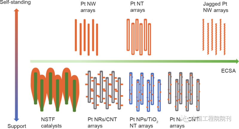 在最近的研究進(jìn)展中,三維有序結(jié)構(gòu)電極,尤其是基于一維催化劑納米結(jié)構(gòu)陣列的電極結(jié)構(gòu)受到了極大的關(guān)注。這種電極結(jié)構(gòu)在降低傳質(zhì)阻力和提高催化劑利用率方面具有獨(dú)特的優(yōu)勢(shì),在開(kāi)發(fā)低催化劑負(fù)載量和大電流密度運(yùn)行的燃料電池方面表現(xiàn)出了巨大的潛力。按催化劑及其載體的結(jié)構(gòu)以及電化學(xué)表面積(ECSA)對(duì)這些三維有序結(jié)構(gòu)電極進(jìn)行分類(lèi),它們的基本設(shè)計(jì)如圖2所示?;阡忼X狀鉑納米線的大電化學(xué)表面積和優(yōu)異催化活性,由其組成陣列的三維有序結(jié)構(gòu)電極盡管目前還沒(méi)有報(bào)道,但在超高功率密度運(yùn)行方面極具潛力。