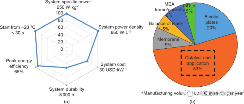 圖1 當(dāng)前PEMFC的發(fā)展?fàn)顩r(a)和電堆的成本構(gòu)成(b)(基于美國(guó)能源部2019年氫能和燃料電池項(xiàng)目的年度評(píng)估報(bào)告)。GDL:氣體擴(kuò)散層;MEA:膜電極。經(jīng)Papageorgopoulos許可,轉(zhuǎn)載自參考文獻(xiàn)
