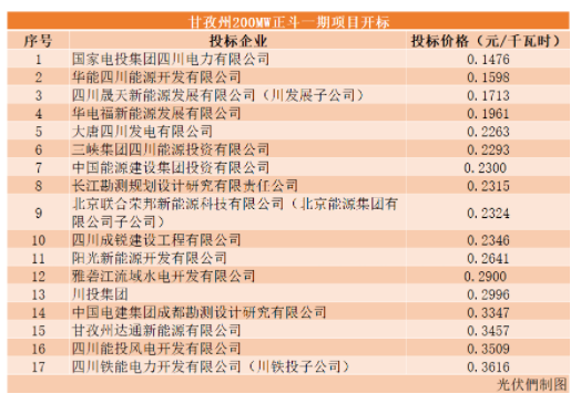 在17家參與投標(biāo)的企業(yè)中,國家電投、華電、三峽、大唐國家開發(fā)投資集團(tuán)以及中國能建、中國電建等電力投資央企悉數(shù)到場。此外,以晟天新能源、四川能投、四川鐵投、川投集團(tuán)、甘孜州達(dá)通新能源等為代表的四川本地國有企業(yè)也深度參與其中。值得強(qiáng)調(diào)的是,此次僅有陽光新能源、四川成銳建設(shè)兩家民營企業(yè)參與。隨著平價(jià)時(shí)代,各省光伏投資產(chǎn)業(yè)配套要求持續(xù)加碼,光伏電站投資開發(fā)領(lǐng)域民營企業(yè)占比進(jìn)一步縮小。以下是投標(biāo)企業(yè)報(bào)價(jià)(由低到高):
