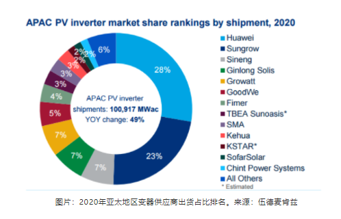 亞太地區(qū)很明顯成為了2020年最大的逆變器市場,其100.92GW的出貨量與2019年相比增長了近50%。其中僅中國就占了全球出貨量的約30%。此外,越南、印度市場均有不同程度的增長。在這一市場,出貨前十的供應商中除了排在第七的Fimer和第九位的SMA以外,全部被中國品牌包攬。華為、陽光電源、上能、錦浪、古瑞瓦特和固德威占據(jù)出貨前六名。僅華為和陽光電源的出貨量占比就達到了亞太地區(qū)總量的51%。