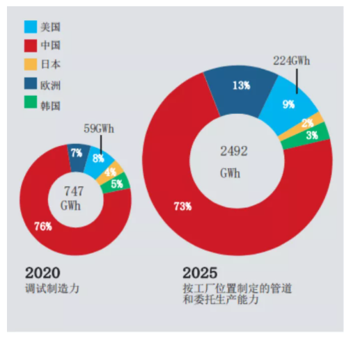 根據(jù)《美國鋰電藍圖2021-2030》指出,鋰電行業(yè)目前正處于臨界點,自2010年以來鋰電成本下降了近90%。這項技術(shù)正在影響全球運輸市場,并有可能在未來幾十年重塑全球行業(yè)。預(yù)計到2025年,中國鋰電產(chǎn)能將達到1811GWh,占比達73%;美國鋰電產(chǎn)能達224GWh,占比9%。