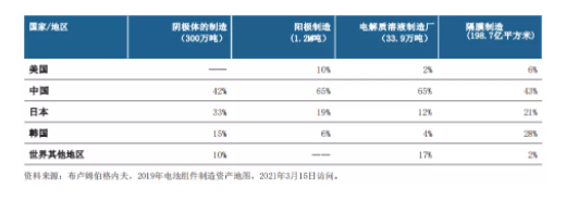 報告指出,中國在動力電池四大核心材料產(chǎn)能制造上已經(jīng)擁有超強的領(lǐng)先優(yōu)勢。其中,在正極材料制造占比達42%,負極材料占比達65%,電解液占比達65%,隔膜制造占比達43%。