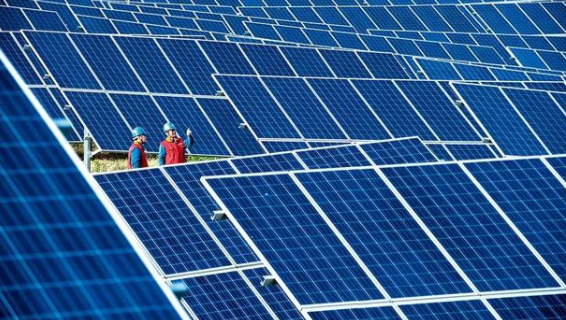 ▲ 4月28日,國(guó)網(wǎng)山東淄博供電公司技術(shù)人員巡檢光伏電站。遠(yuǎn)德亮攝