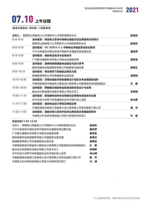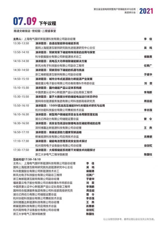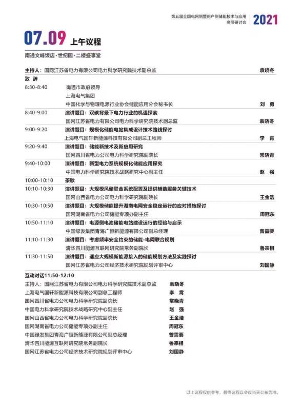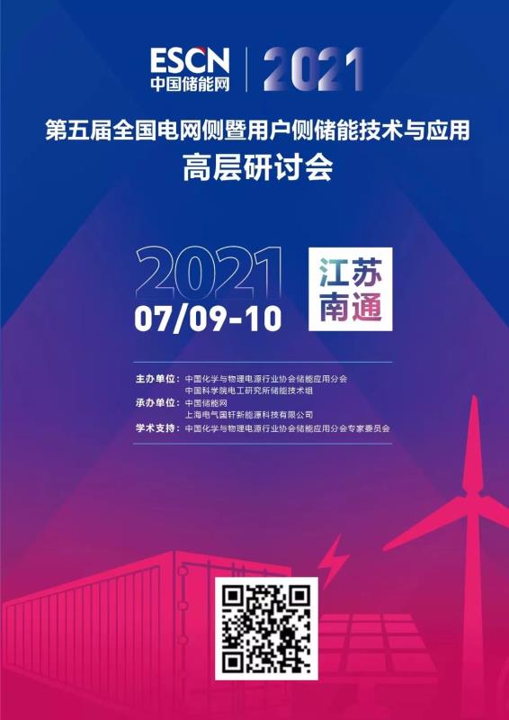 中國儲能網訊:為進一步探討在電網側及用戶側建設儲能電站,緩解高峰負荷對電網的沖擊,同時探索平滑新能源和調頻輔助服務等應用模式,提升項目運行經濟性,中國化學與物理電源行業(yè)協會儲能應用分會決定聯合江蘇省電機工程學會、中國能源建設集團江蘇省電力設計院有限公司等單位于2021年7月9—10日在江蘇省南通市文峰酒店召開“第五屆全國電網側暨用戶側儲能技術應用高層研討會”,具體議程如下(最終議程以活動當天發(fā)布為準):