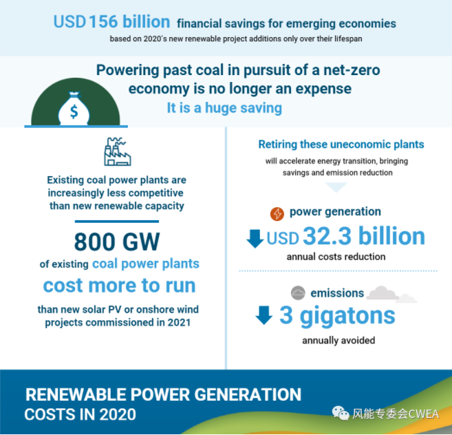 IRENA在官方報(bào)告新聞發(fā)布會(huì)上透露,新的報(bào)告證實(shí)可再生能源將為新興經(jīng)濟(jì)體節(jié)省 1560 億美元的成本,因此各國(guó)應(yīng)敦促不再使用煤炭發(fā)電。IRENA指出,與最具競(jìng)爭(zhēng)力的化石燃料相比,成本更低的可再生能源份額在 2020 年翻了一番。去年新增的 162 GW可再生能源發(fā)電或占可再生能源發(fā)電總量的 62% 的成本,已低于最便宜的新增化石燃料發(fā)電。