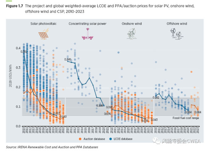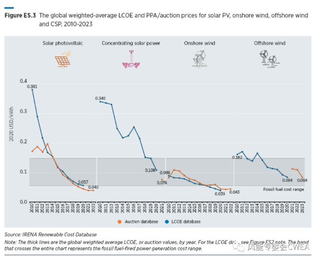 2010-2023年全球光伏、陸上和海上風(fēng)電、CSP平均加權(quán)LCOE和PPA拍賣(mài)價(jià)格變化情況