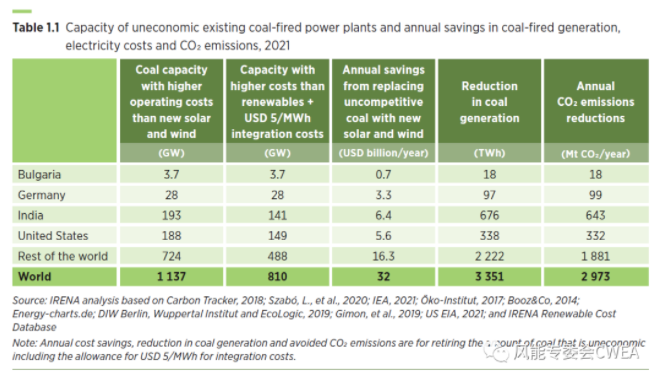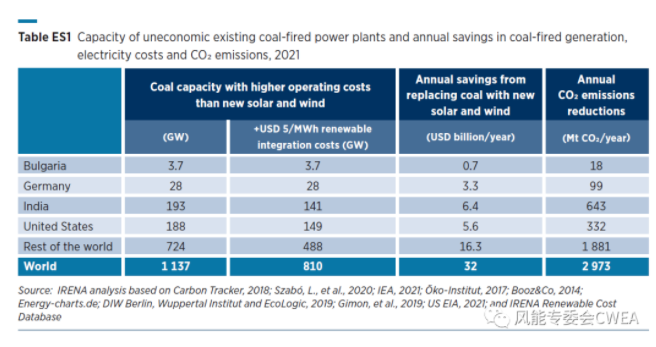 放眼全球,有超過(guò) 800 GW 的現(xiàn)有煤電成本均高于 2021 年投產(chǎn)的新建太陽(yáng)能光伏或陸上風(fēng)電項(xiàng)目。關(guān)閉這些煤電廠(chǎng)每年可減少高達(dá) 323 億美元的發(fā)電成本,每年可減少約 3 吉噸的二氧化碳排放量,這個(gè)數(shù)據(jù)相當(dāng)于 2020 年全球能源相關(guān)二氧化碳排放量的 9%,IRENA《世界能源轉(zhuǎn)型展望》所述的 1.5°C 氣候目標(biāo)藍(lán)圖中到 2030 年目標(biāo)減排量的 20%。