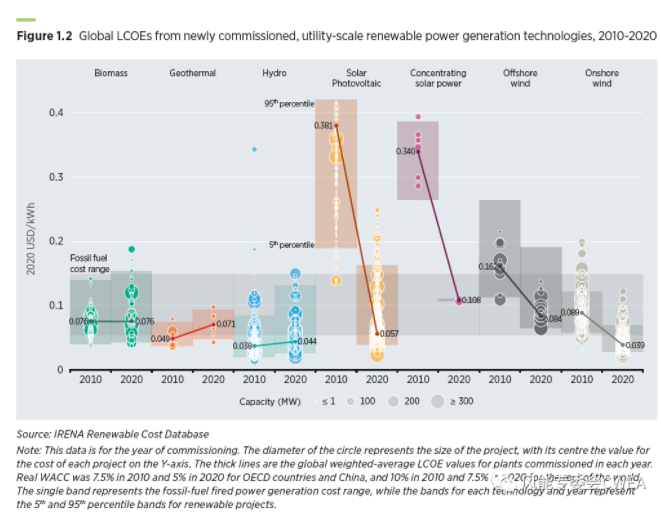 2010-2020年,全球新投產(chǎn)、公共事業(yè)規(guī)??稍偕茉窗l(fā)電廠(chǎng)按技術(shù)列出的LCOE成本區(qū)間,本圖列出了項(xiàng)目規(guī)模情況,用彩色圓點(diǎn)的直徑表示。
