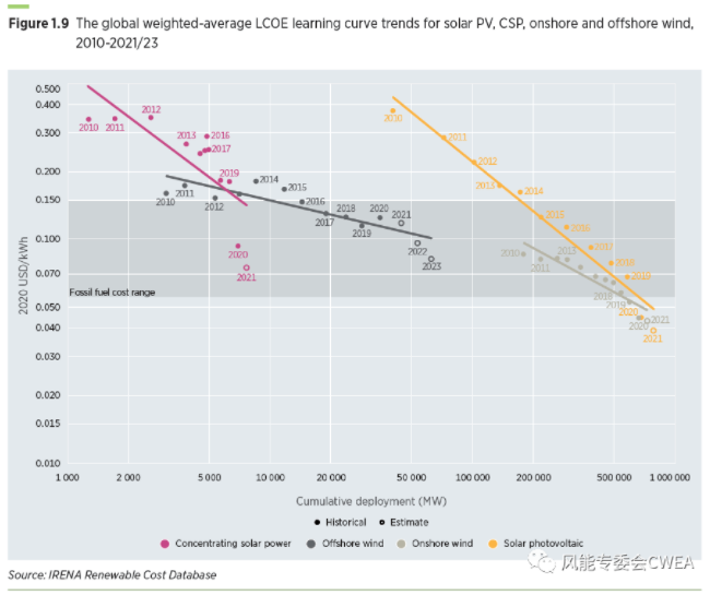 學(xué)習(xí)曲線(xiàn)和化石燃料成本范圍相交情況,可看出太陽(yáng)能光伏和陸上風(fēng)電已經(jīng)下探到化石能源價(jià)格區(qū)間底部之下。