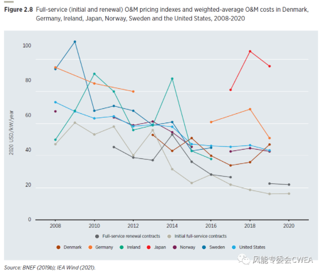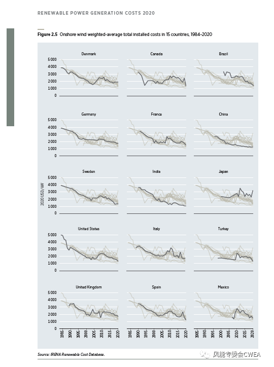 15個(gè)國(guó)家陸上風(fēng)電總安裝成本趨勢(shì)
