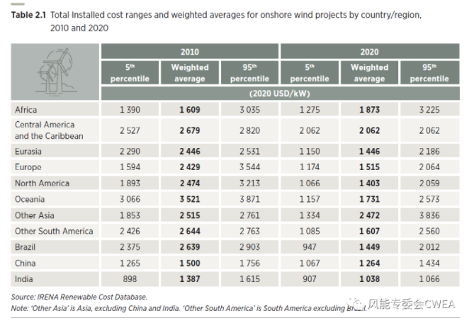 按國(guó)家地區(qū)分列的陸上風(fēng)電總安裝成本范圍和加權(quán)平均值(2010和2020年對(duì)比)