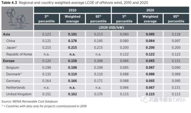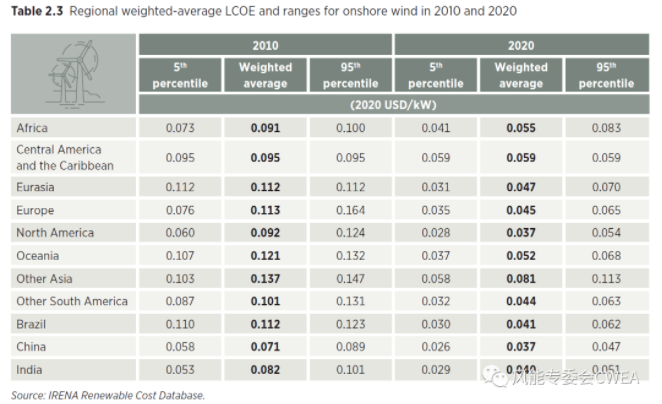 按國(guó)家地區(qū)分列的陸上風(fēng)電LCOE范圍和加權(quán)平均值(2010和2020年對(duì)比)