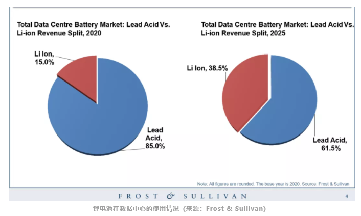 Frost & Sullivan分析認為,2020年,鋰離子電池占全球數(shù)據(jù)中心電池市場的15%,但隨著鋰離子電池在數(shù)據(jù)中心應用的不斷增加,預計到2025年,這一比例將顯著上升至38.5%。