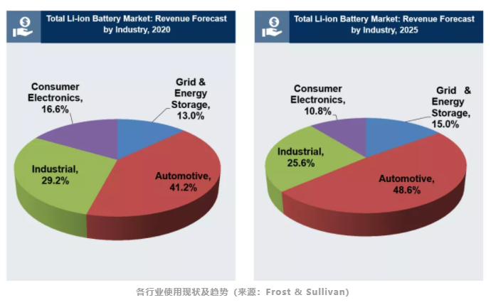 包括工業(yè)、電網(wǎng)和儲能、汽車和消費電子產(chǎn)品等數(shù)據(jù)中心細分行業(yè)將越來越多地使用鋰離子電池。其中,隨著清潔能源技術(shù)的日益采用,以及對儲能系統(tǒng)(ESS)的需求不斷增長,預計將使儲能應用在總市場中的總體貢獻從2020年的13%提高到2025年的15%。